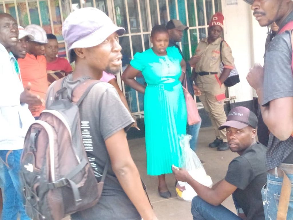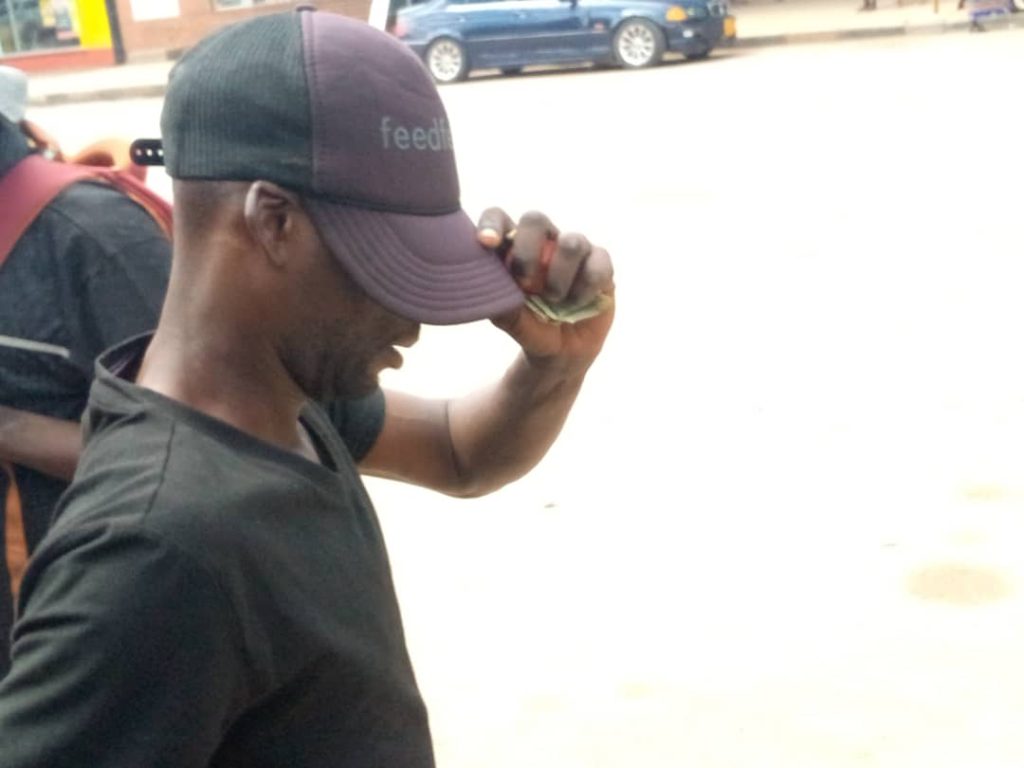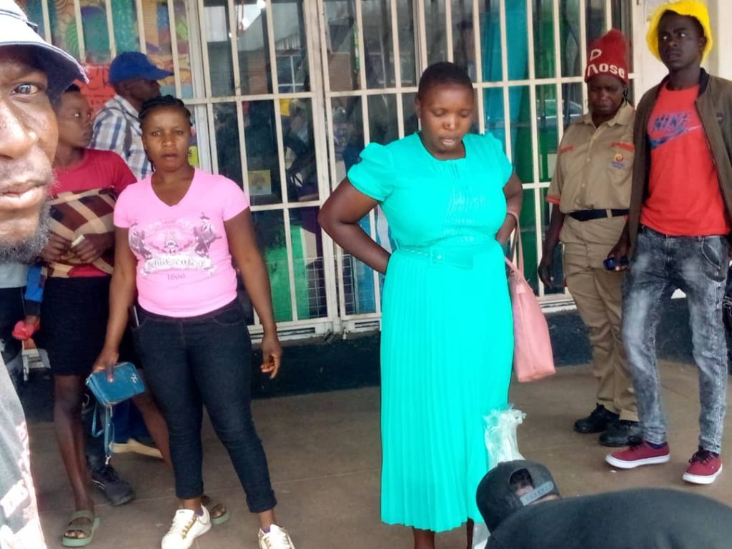 A woman in blue played feja feja, lost all the money and she is now stranded in town, Gweru, after the man in black T shirt and his colleagues defrauded her.