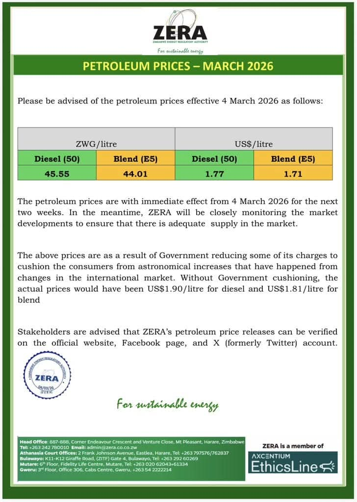 ZERA said the prices take immediate effect from the 4th of March and will remain in place for the next two weeks while the authority continues to monitor developments on the international market.
