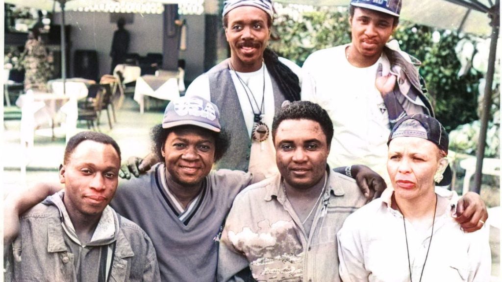 Members of Paris-based Soukous Stars, among them the late Lokassa ya Mbongo (2nd left), when they arrived in Nairobi to perform at the URTNA concert in 1993.