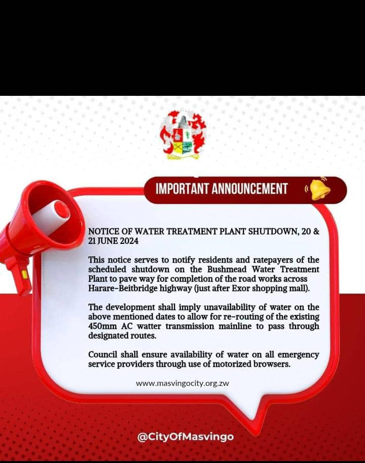 “Scheduled shutdown on the Bushmead Water Treatment Plant to pave way for completion of the road works across Harare-Beitbridge highway,” reads part of the notice issued to residents by the City of Masvingo.