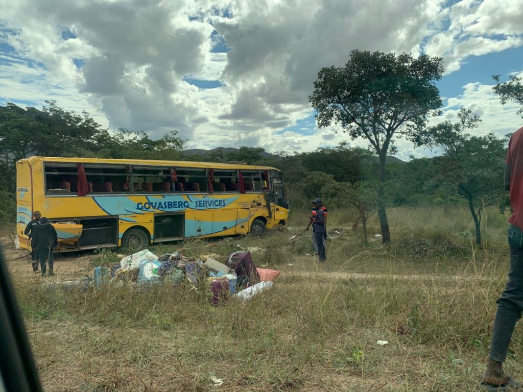 The accident happened today in the morning when a Govasberg Services bus travelling from Masvingo tried to overtake a tractor and suddenly went back to its lane upon seeing an oncoming vehicle, hitting the tractor into pieces and killing two people on the spot.