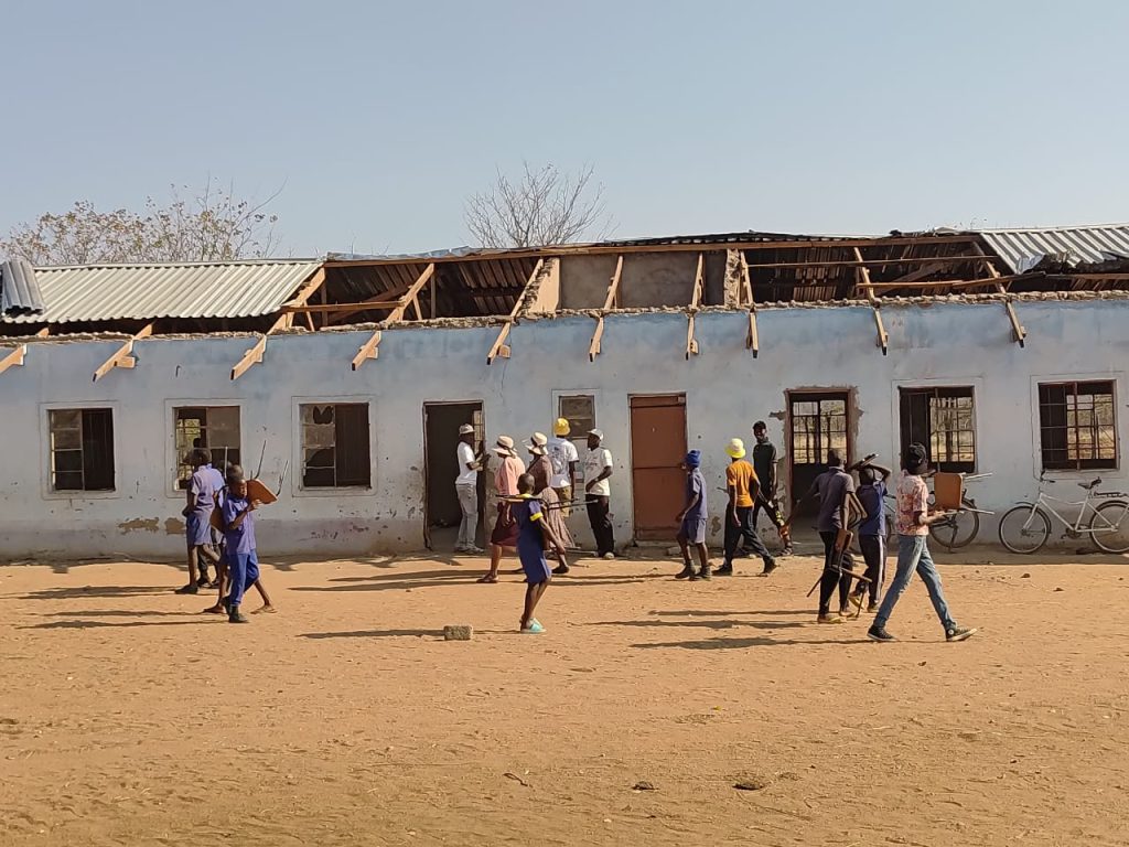 “I am really sorry about this sad incident which l am witnessing here at Mangondi Primary. What makes the situation pathetic is that in two weeks time Grade seven learners will be seating for their final examinations, hence the need for us to expedite the repairs. To that end, l have brought one hundred standard zinc roofing sheets and window panes towards the roofing of the classroom block” said MP Chikomo, igniting joyous celebrations from the parents.