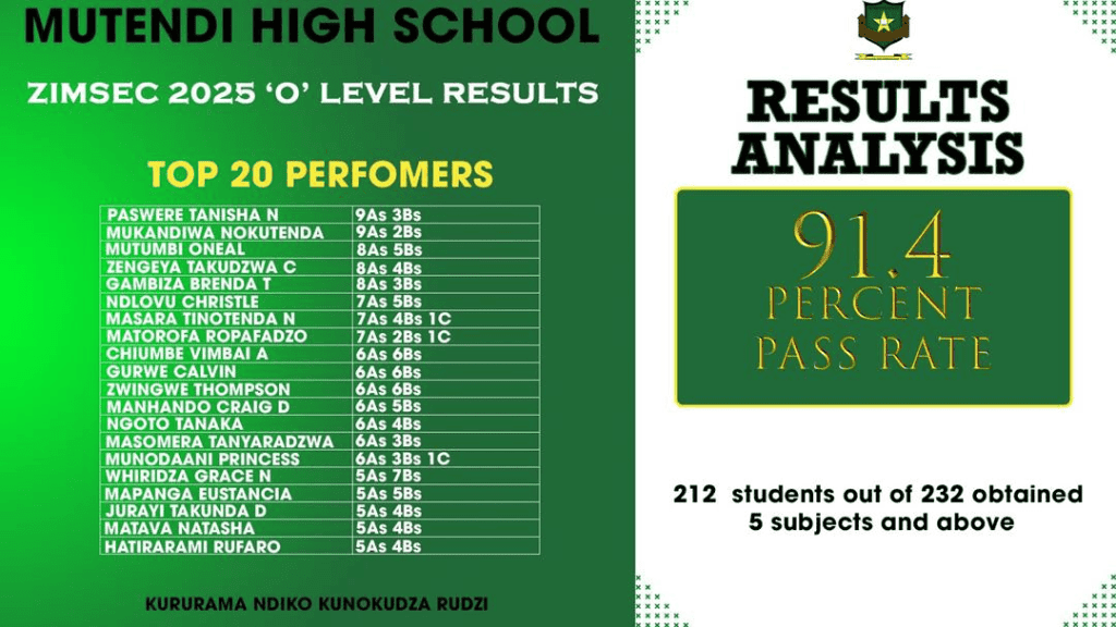 Masvingo-Zion Christian Church run Mutendi High School has produced remarkable results for the 2025 ZIMSEC O-Level examinations, reinforcing the institution’s motto “Kururama ndiko kunokudza rudzi” once more.